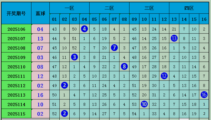 上期蓝球开出号码02,近十期蓝球在一区开4枚,二区开出号码2枚,三区开出2枚,四区开出2枚,区间比4:2:2:2,本期推荐蓝球出现在四区,重点关注15。