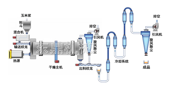 玉 米皮和玉米漿經調合一定比例后,在混合機內進行攪拌混合,混合后含水量在35~40%的濕玉米皮由上料機輸送到進料機由進料機進入干燥機滾筒內,熱風爐提 供熱源,熱風溫度在350±50℃,玉米皮在干燥滾筒內均布的抄板器翻動下,均勻分散與熱空氣充分接觸,達到傳熱、傳質的干燥目的。烘干后的玉米皮渣在滾 筒終端經星形卸料器排出,成品水份在10%以下,由出料機輸出物料,烘干后物料的溫度在70-80℃之間,輸出的物料進入冷卻系統,冷卻后物料在 30-40℃之間,可以包裝,物料干燥程度與顏色均勻一致,達到產品的入庫標準,完成干燥和冷卻的要求。